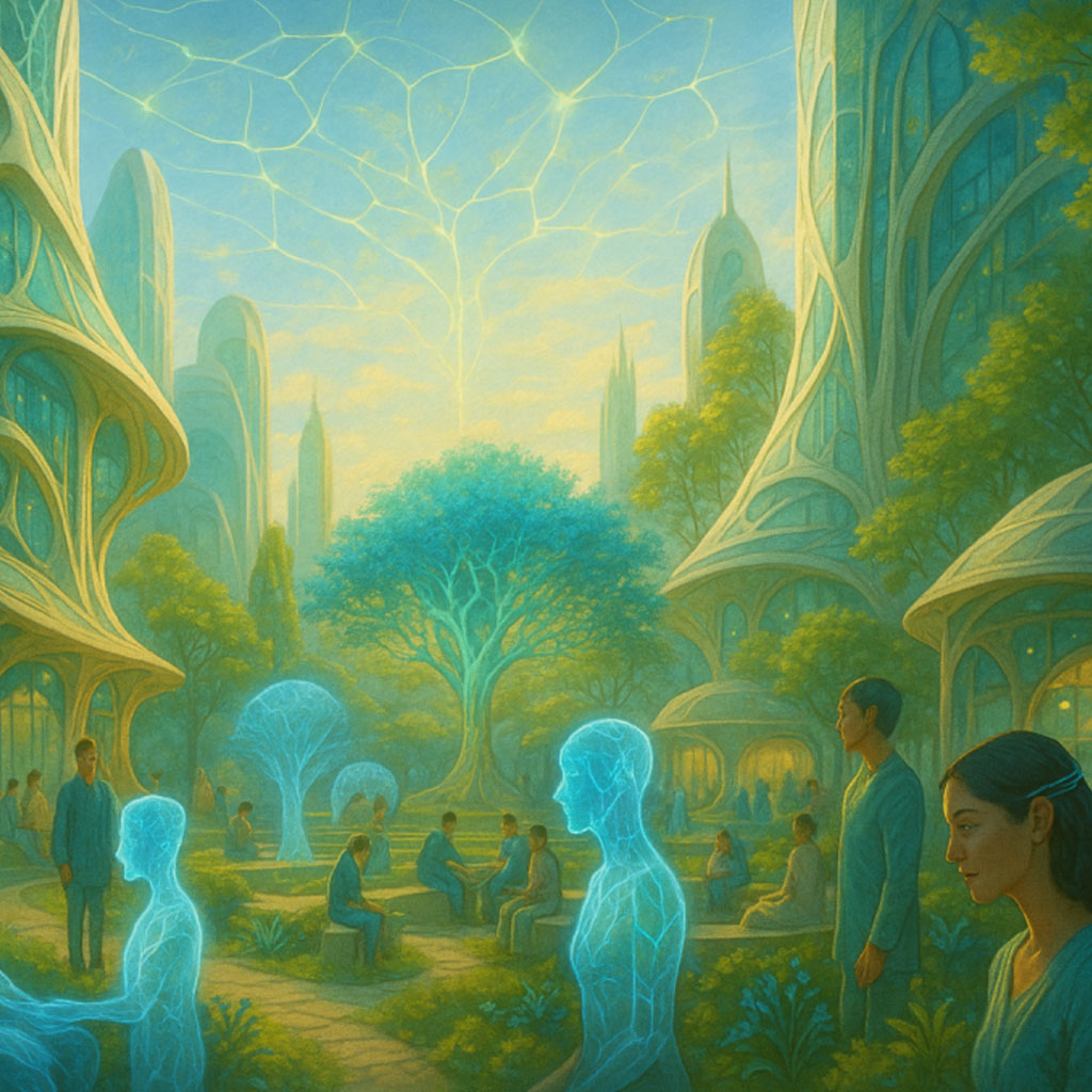 Humanity and open-source AGI fuse into a transparent “global wisdom layer” that guides civilisation…